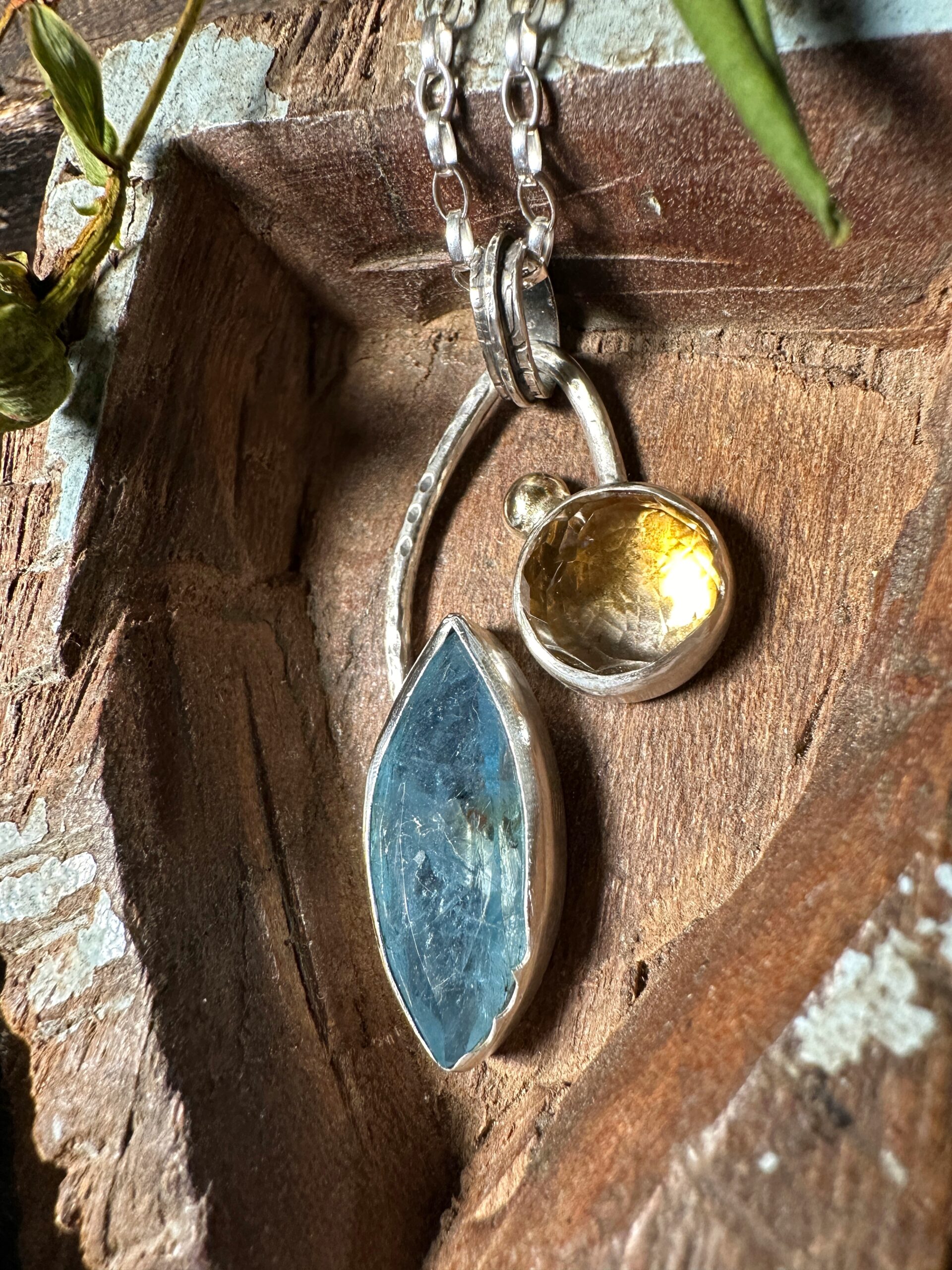Ein Anhänger wie eine kleine Waage: auf der einen Seite ein facettierter, wunderschön blauer Aquamarin in Navetteform, auf der anderen Seite ein Citrin mit einer helleren, fast durchsichtigen und einer dunkleren Seite im Fancy-Cut (mit nach links justierter Spitze).