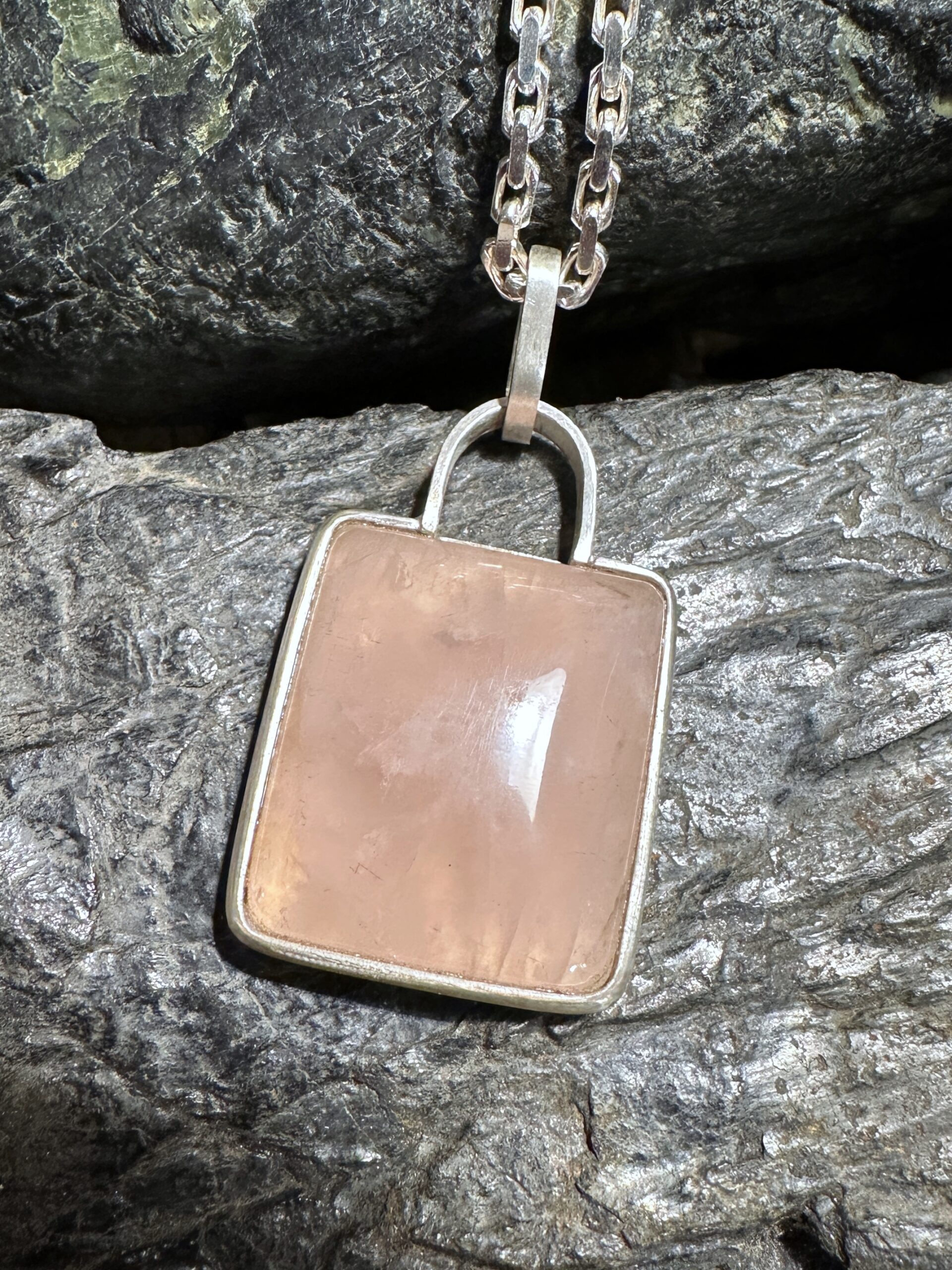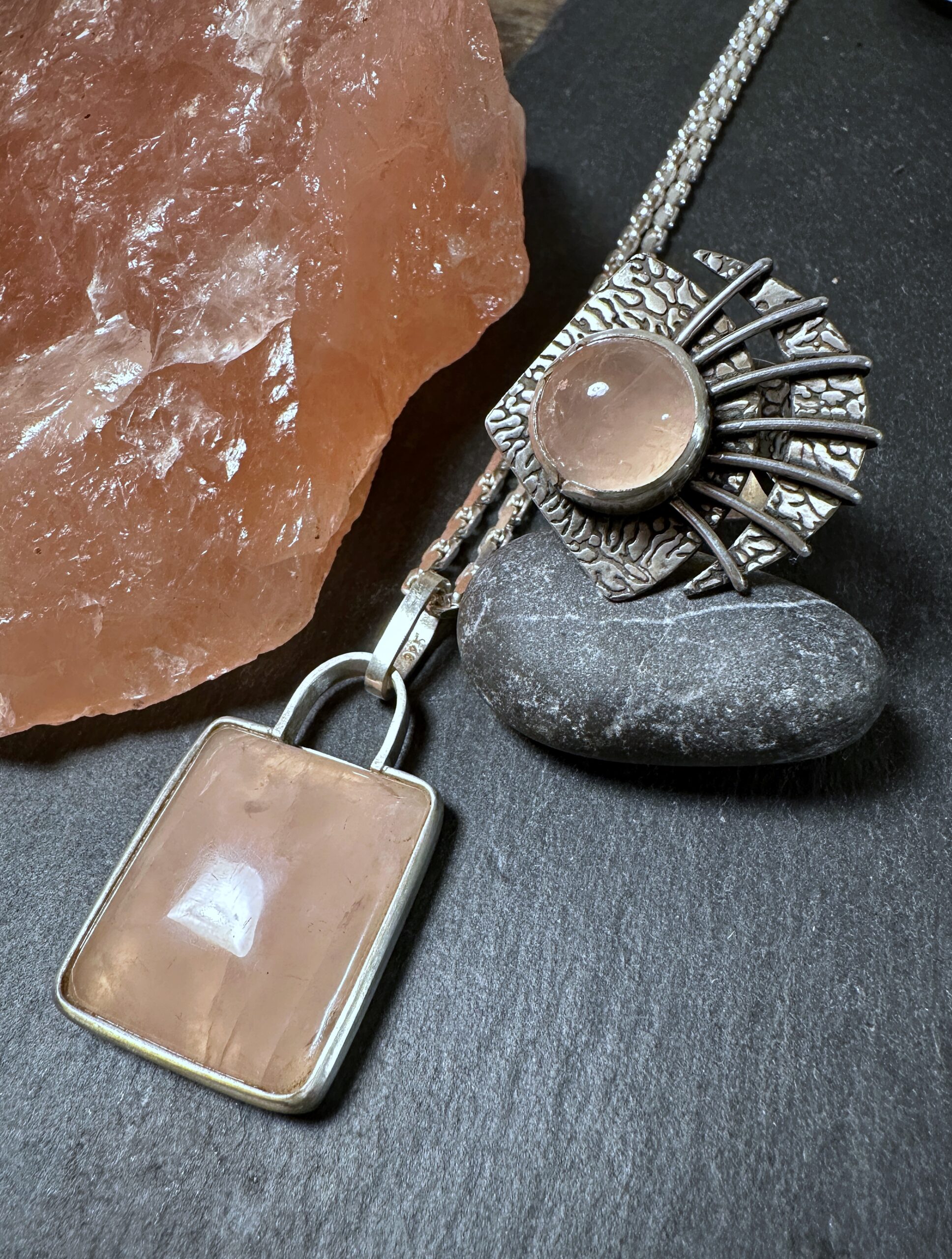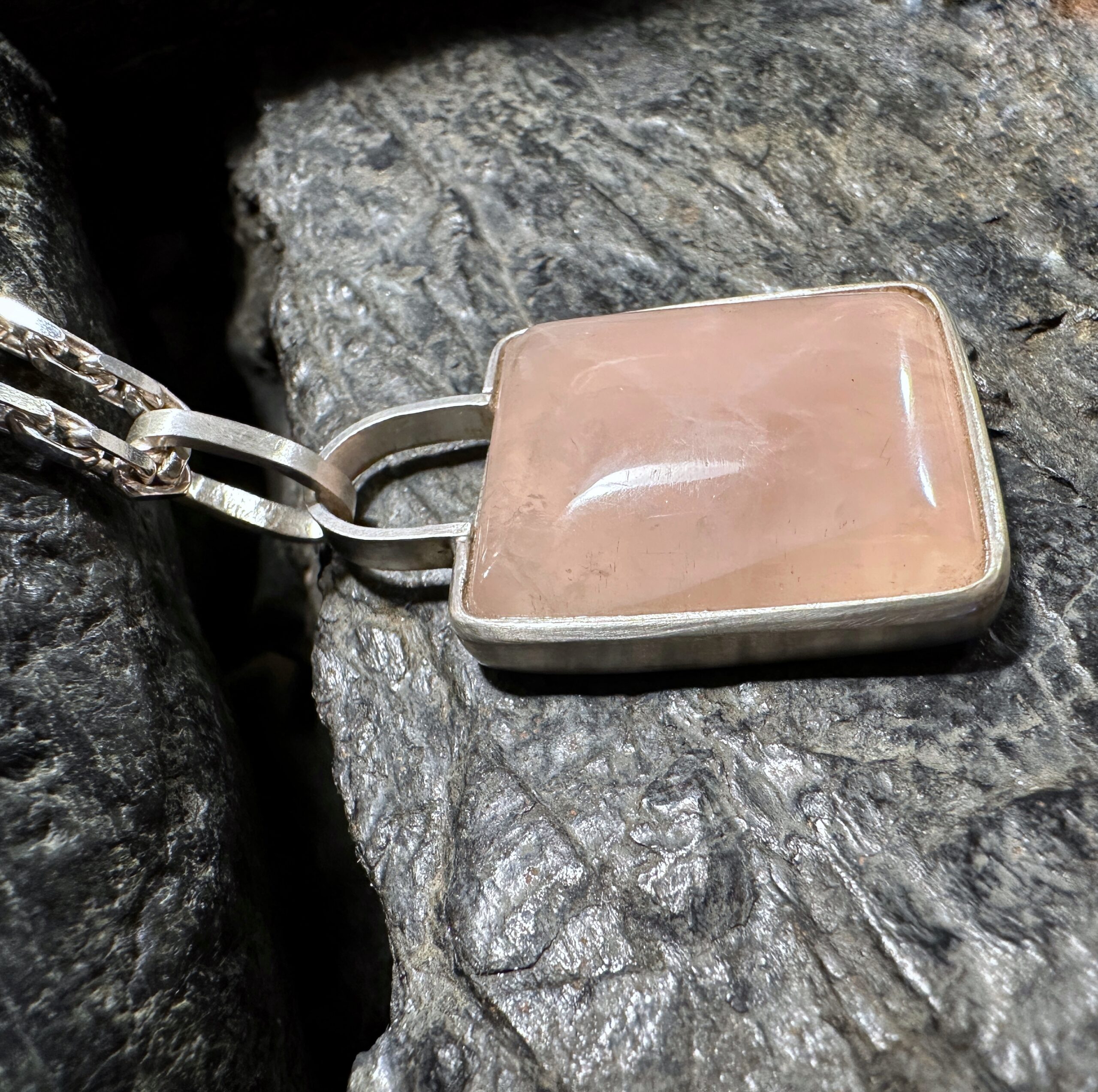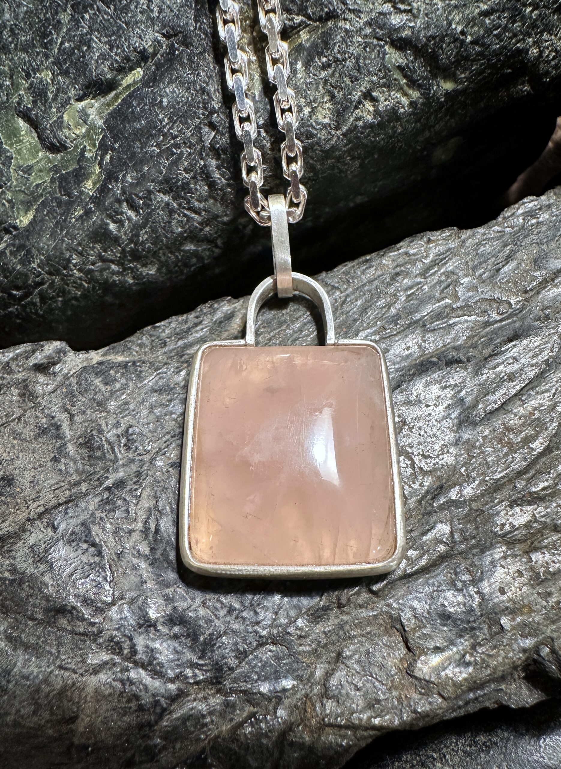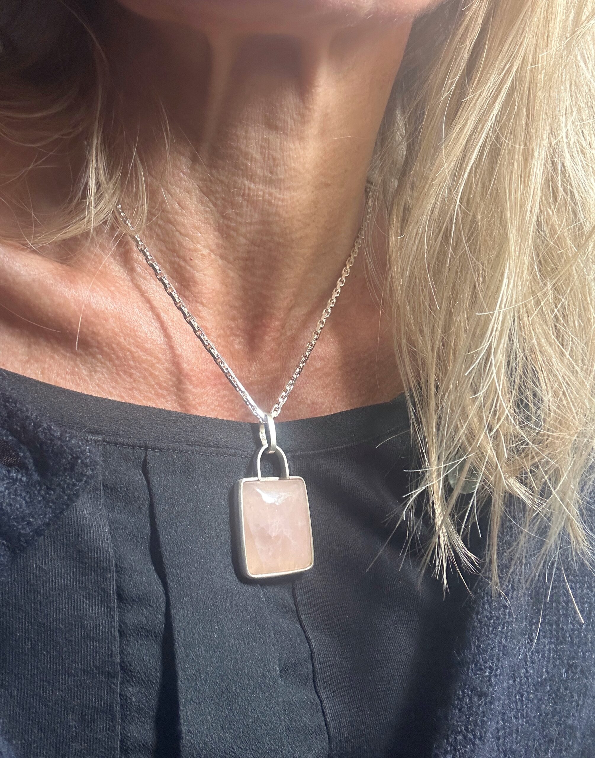 diese Worte fallen mir ein, wenn ich diesen klar designten Anhänger mit natürlichem Rosenquarz sehe. Die Schönheit liegt in der schlichten Eleganz, die er ausstrahlt
