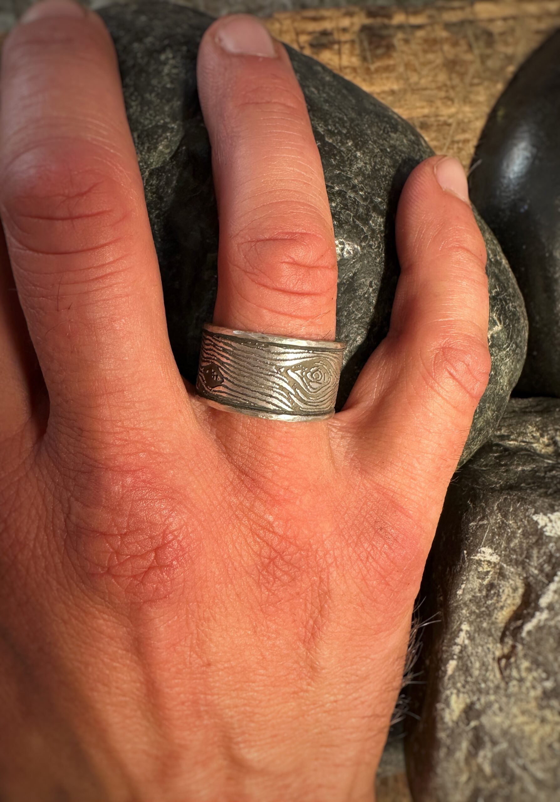 Der Ring „Mein Holz“, der von Hand geschmiedet wurde, zeigt rundherum eine schöne Holzstruktur, welche durch das Schwärzen des Edelmetalls noch besser hervortritt.