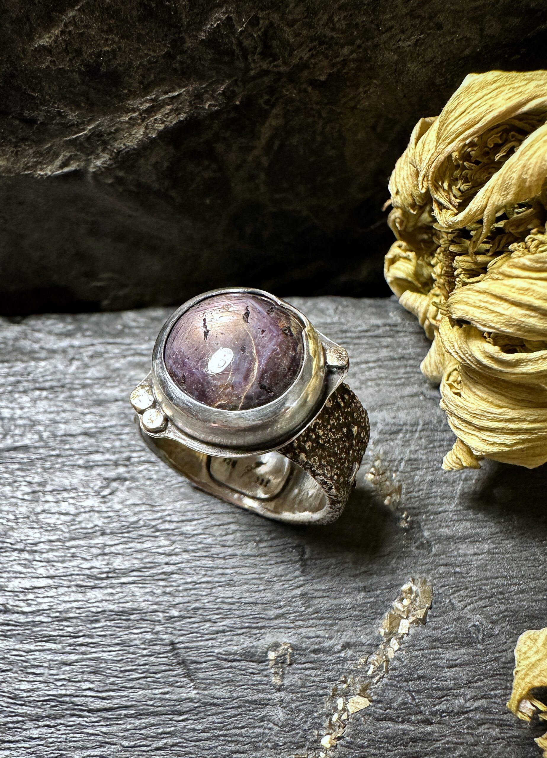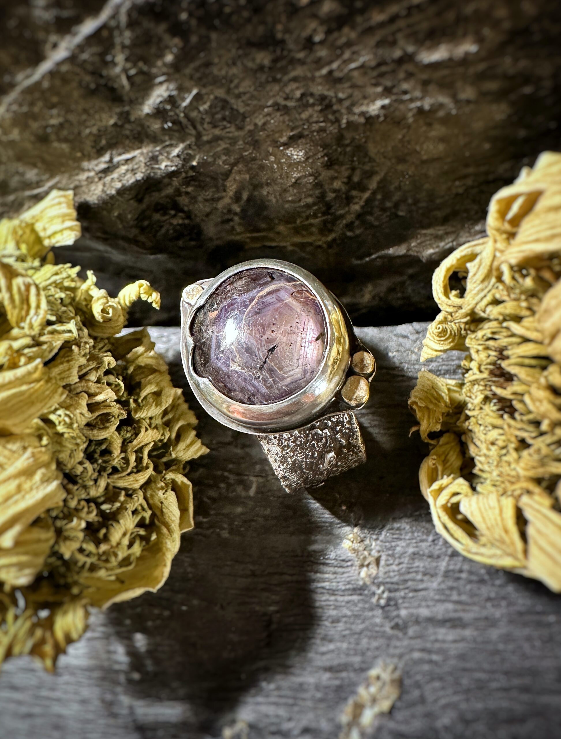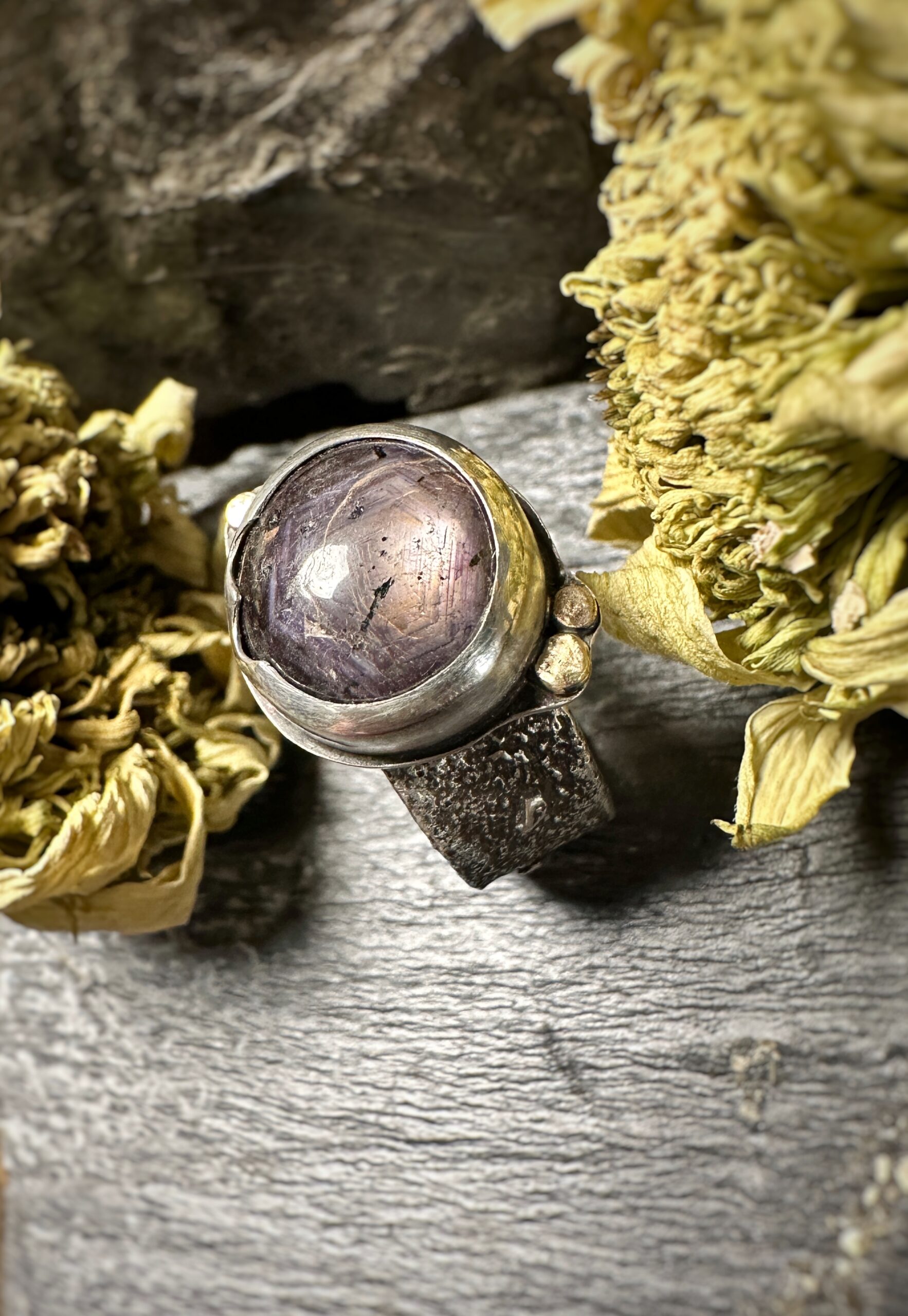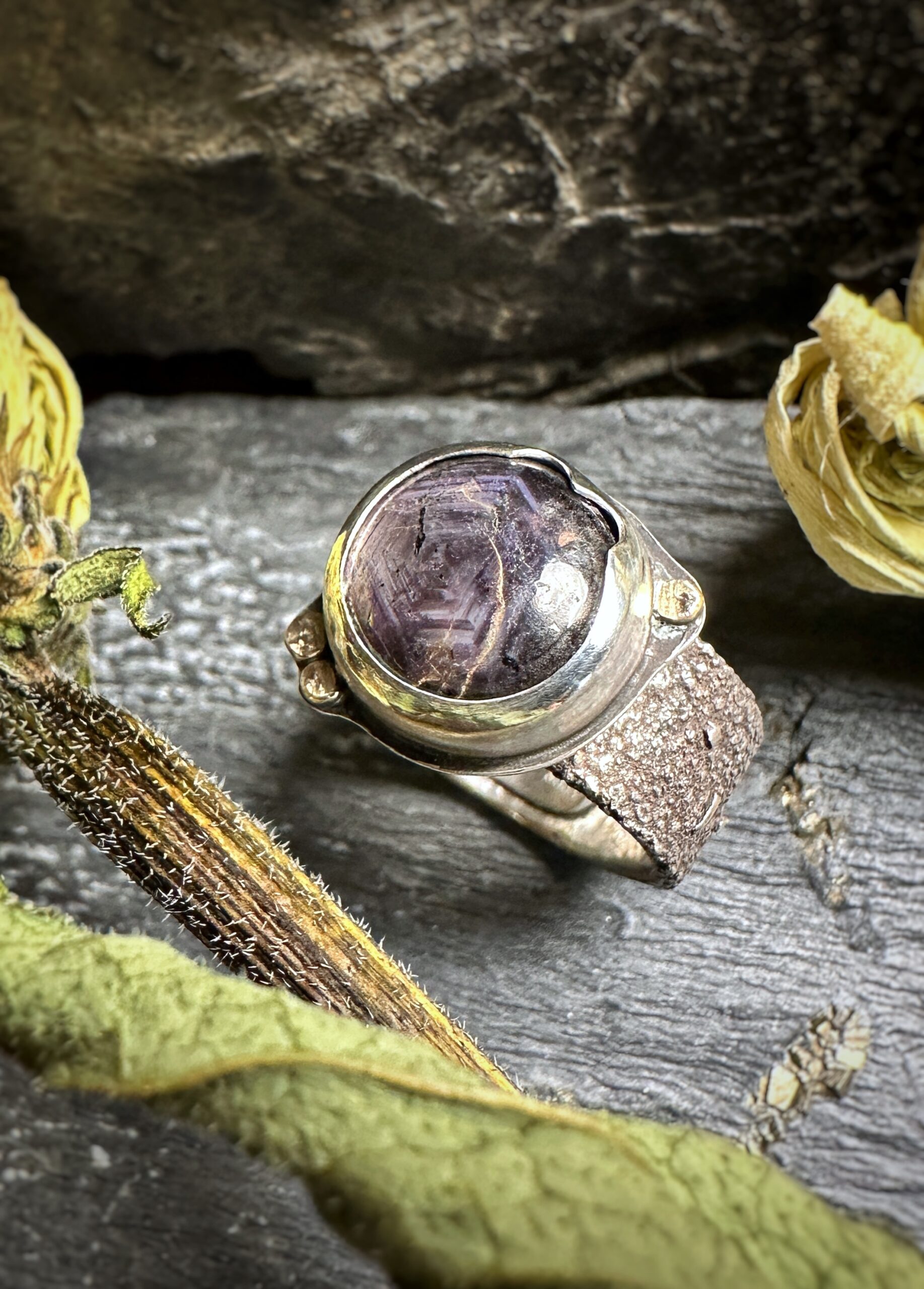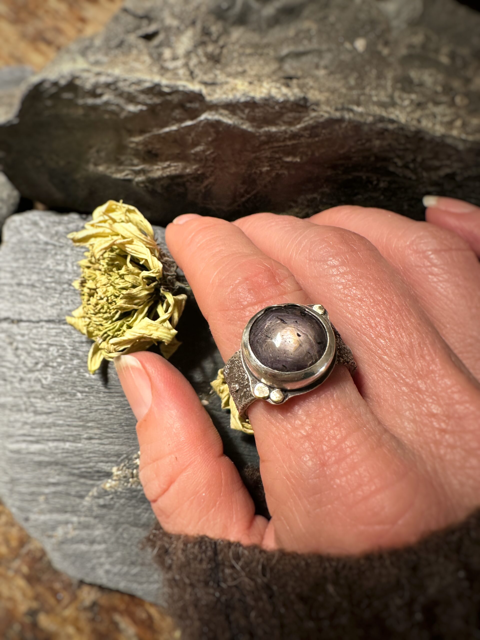 Im Sonnenlicht zeigt das schöne Mineral, das dem Ring sein Highlight gibt, einen goldenen Schimmer und das für Korunde typische Hexagon.