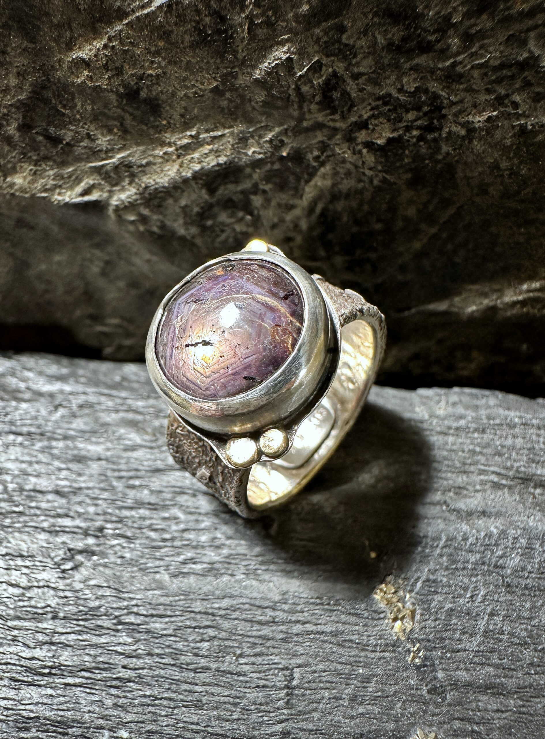 Die Ringschiene wurde mit der Flamme mehrmals stark bearbeitet, sodass eine individuelle Struktur entstand. Die Ringschiene ist ca. 8,5 mm breit. Alle Teile sind aus massivem Edelmetall (Sterlingsilber, Gelbgold).